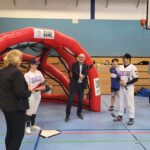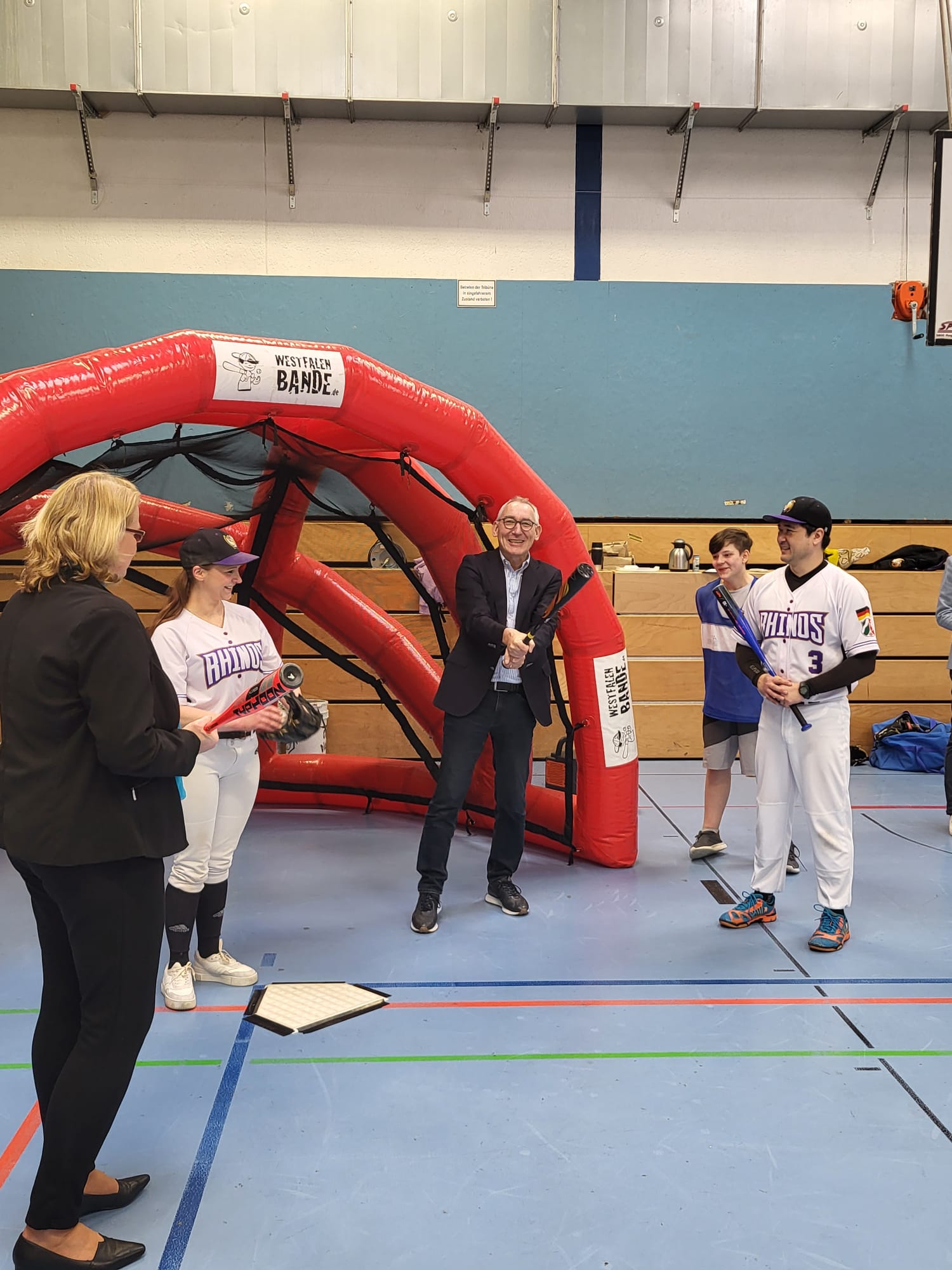 Beim Besuch von Regierungspräsident Heinrich Böckelühr und Sportdezernentin Birgit Zoerner präsentierte sich auch die Baseball-AG der Schule – unterstützt von den Dortmund Rhinos.