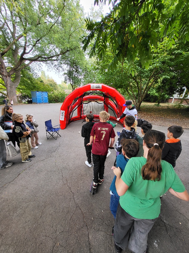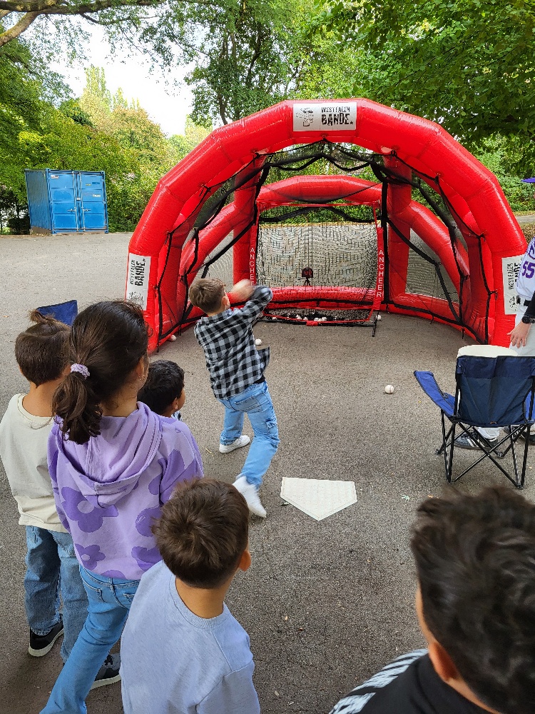 Zunächst hieß es: Schläger in die Hand und volle Konzentration auf den Ball. Viele Kinder erlebten dabei ihr erstes „echtes“ Schlagtraining und freuten sich, wenn sie den Ball sauber trafen. Im zweiten Durchgang wurde es dann richtig spannend: Ein Wurfgeschwindigkeitsmesser zeigte an, wie schnell die Bälle Richtung Ziel flogen. Der Tagesrekord lag bei beeindruckenden 68 km/h – eine Leistung, die nicht nur die Kinder, sondern auch die Lehrkräfte ins Staunen brachte.